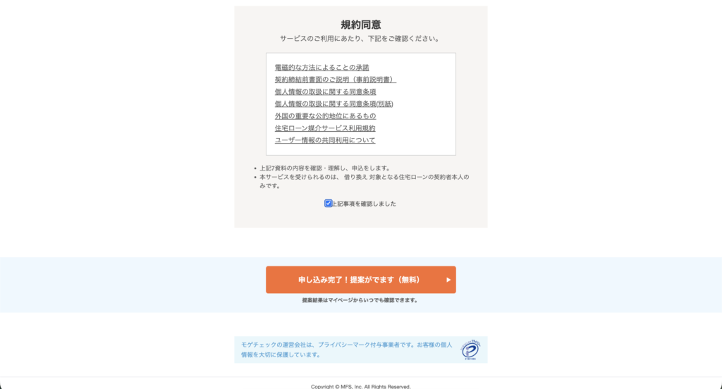 最後に入力内容をザッと確認し、規約に同意して「申し込み完了」をクリックすれば、これだけで診断の手続きはすべて終了です!